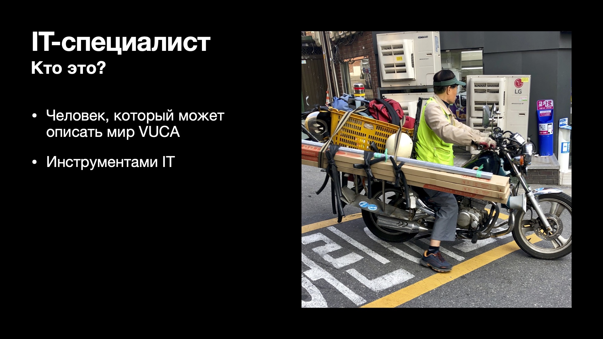 После первой краткой части пошла основная часть «Востребованный специалист в современном мире или о чем вам не расскажут работодатели». Я пошел прямо по пунктам, но в обратном порядке. Для описания современного мира я начал с прекрасной идеи Идриса Аберкана про экономику идей, которая уже замещает экономику денег, и это неизбежно будет происходить и дальше. Добавил это принципом VUCA. Затем мы поговорили про то, кто же такой IT-специалист в этом мире, зачем он нужен, и кратко прошли по востребованности, как ее померить и достичь.